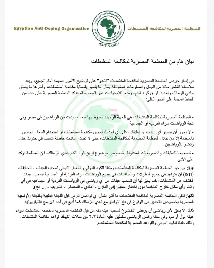 في إطار حرص المنظمة المصرية لمكافحة المنشطات “النادو”، على توضيح الأمور المهمة أمام الجميع، وبعد ملاحظة انتشار حالة من الجدل والمعلومات المغلوطة، بشأن ما يتعلق بقضايا مكافحة المنشطات، وآخرها ما يتعلق بنادي الزمالك، لذلك تؤكد المنظمة المصرية على عدد من النقاط المهمة على النحو التالي: