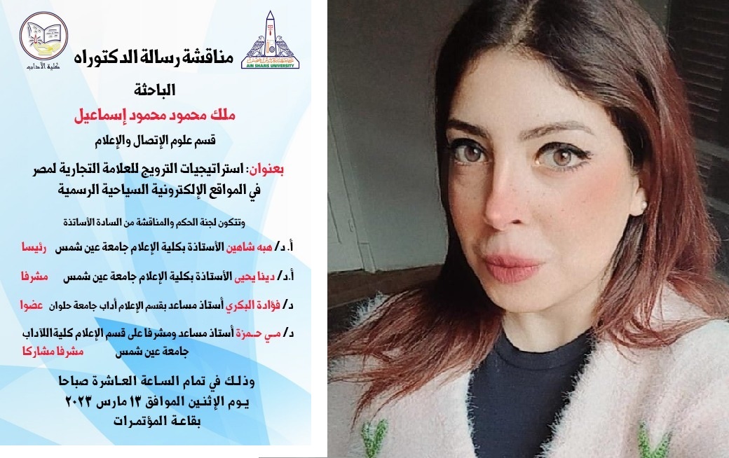 تناقش الباحثة “ملك اسماعيل” مديرة التسويق بالمصرية الدولية للنشر والتوزيع، رسالة الدكتوراه من كلية الآداب بجامعة عين شمس قسم الإعلام االيوم الإثنين الموافق 13 مارس 2023 بقاعة المؤتمرات في العاشرة صباحا؛ والتي تحمل عنوان: استراتيجيات الترويج للعلامة التجارية لمصر في المواقع الإلكترونية السياحية الرسمية، ومواقع التواصل الاجتماعي للوقوف على الإستراتيجيات التي تعتمدها الجهات الرسمية للترويج السياحي لمصر عالميا.