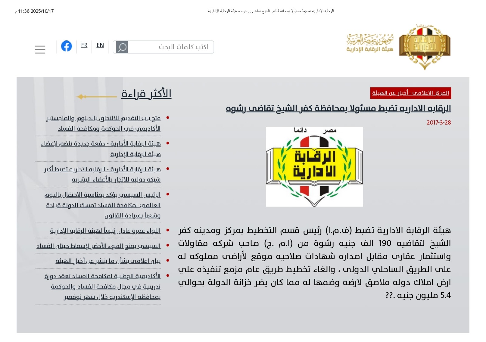 وقد سبق أن حررت الرقابة الإدارية عام ٢٠١٧ قضية رشوة لمدير التخطيط العمراني بمبلغ ١٩٠ ألف جنيه.